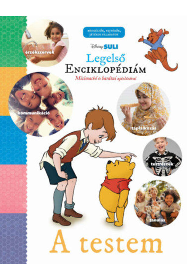 Fejtsd meg a csodálatos emberi test titkait! Micimackó és barátai segítenek, hogy megtudd, mi történik a testedben, amikor lélegzel, alszol, eszel, írsz vagy éppen sétálsz. Megismerheted az öt érzékszerv felépítését, megvizsgálhatod, mire van szüksége a testednek, ahhoz, hogy megfelelően működjön, és azt is megfigyelheted, hogyan kommunikálunk egymással. A Legelső Enciklopédiámban látható fantasztikus fényképek azonnal felkeltik a gyerekek figyelmét, a megannyi szórakoztató információ hallatán biztosan sokat nevetnek majd és közben rengeteget tanulnak. A fejezetek végén található játékos feladatok pedig garantáltan vidám élménnyé teszik a közös olvasást!
